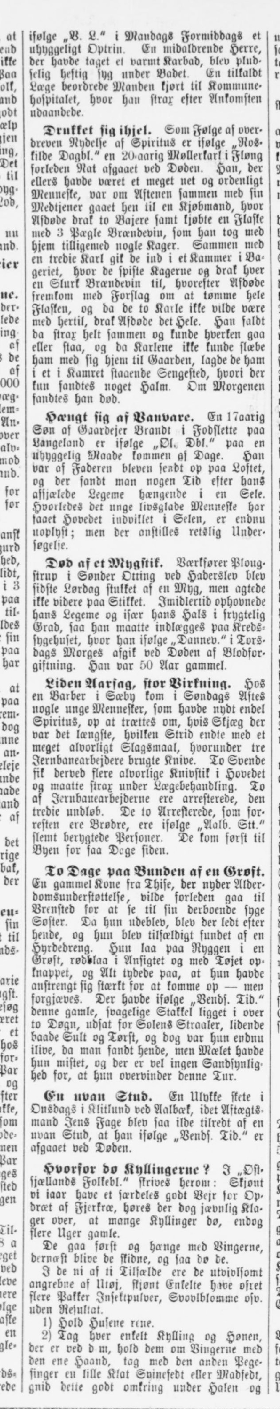 ifølge „V. L " i Mandag« Formiddag« et »hyggeligt Optrin. E» midaldrende Herre, der havde taget et varmt Karbad, blev pludselig heftig syg under Badet En tilkaldt Læge beordrede Manden kjort til Kommune- hospitalet, hvor han strax efter Ankomsten udaandede. Trukket sig ihjel. Som Følge as over- dreven Nydelse as Spiritus er ifølge „RoS- kilde Dagbl." en 20-aarig Møllerkarl i Fløng forleden Nat afgaaet ved Døden . Han, der ellerS havde været et meget net og ordcnligt Mennefle, var om Aftenen sammen med sin Medtjener gaaet hen til en Kjøbmand, hvor Asdøde drak to Bajere samt ljøbte en Flafle nied 3 Pægle Brændevin, som han tog med hjem tilligemed nogle Kager. Sammen med en tredie Karl gik de ind i et Kammer i Ba- geriet, hvor de spiste Kagerne og drak hver en Slurk Brændevin til, hvorefter Afdøde fremkom med Forflag om at tømme hele Flaflen, vg da de to Kaile ikke vilde være med hertil, drak Afdøde det Hele. Han faldt da strax helt sammen og kunde hverken gaa eller staa, og da Karlene ikke kunde slæbe ham med sig hjem til Gaarde«, lagde de ham i et i Kamret staaende Sengested, hvori der kun sandtes noget Halm Om Morgenen fandtes han død. H