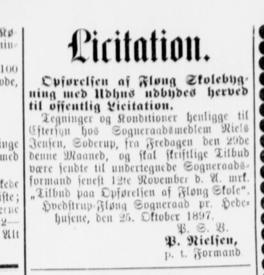 i'iritntion. Cviurtift'ii as Flong Skolebyft iiliig meb Ildhu« udbyde« herved I il osjciitlift Licitation. Tegninger og Stonbitioner henligge til (iftrrfgn hos Sognrraabsmeblem Niels Jensen, Soderup, sra Fredagen ben 2'.»de benne Maaneb, og skal skristligr Tilbud være senbtr til nnbertegnebe Sugncraub«- ormanb senest litc Novcmbei b. VI nuf. „tilbud paa Opførelsen as Fløng Skole". Hvebstrup Fløng Sogncraad pr. Hebe< husene, ben 25. Oktober 1897. P. S. V. P. Nielsen, |i. t. Formanb