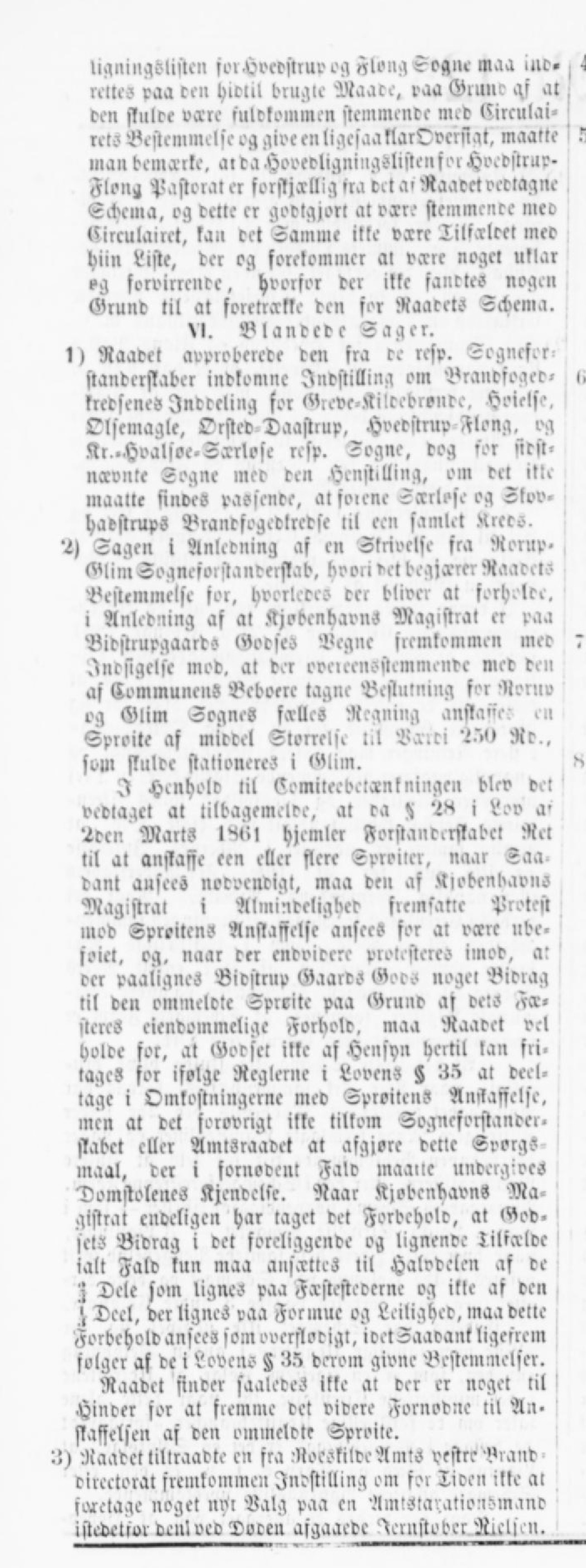 ligningSlisten svi Hvedstrup og Fløng Sogne maa iue- rettes paa den hidtil brugte Maade, taa ©rune if at ten flnlre vcrre fuldkommen stemmende med Circulai- rets Bestemmelse eg give en ligcsaaklarOverfigt, maatte man bemærke, ar da Hovedligningslistenfor Hvedstrup- Flong Pastorater forfljælliz fra det at Raadet vedtagne Schcina, og dette er godtgjort at vcrre stemmende med Kirculairct, kan det Samme ikke vcrre Tilfældet meo hiin Liste, der og forekommer al vcrre noget uklar og forvirrende , hvorfor der ikke fandtes nogen ©rund til at foretrcrtte den for Raatets Schema. VI. Blandede Sager. 1) Raavet approberede ten fra re refp. Sognefor- standcrflaber indkomne Indstilling om Brandfoged« kredsenes Inddeling for ©reve-Kiltebrontc, Hoielfe, Olsemagle, Orsted Daastrup, Hoetstruv Flong, vg Kr-Hvalsøe-Særlose rcsp. Sogne, dog for sidst- nccvnte Sogne med den Henstilling, om del itte maatte sindes passende, al forene Scrrlose og Skov- hadstrups Brantfogedlrcdse til een samlet Xrcrs. 2j Sagen i Anledning af en Skrivelse fra Norup- ©lim Sogneforstanderstab, hvori det begjcrrer NaadctS Bestemmelse for, hvorledes der bliver al forholde, i Anledning af at KjobcnhavnS Magistrat er paa Bidstrupgaards Godset Begne fremkommen meo Indsigelse mod, at der oveicensstemmendc med den af Kommunens Beboere tagne Beflutning for Rornv og ©lim Sognes fcrllcs Regning anflasiec en Sproite af middel Størrelse til Værdi 259 Rr., som stultc stationeres i Glim. I Henhold til Kvmitecbelænkningen blev det vedtaget at tilbagemelvc, at ra S 2M i Lov a> '2den Marts 1361 hjemler Aorstanterflabct Ret til at anskaffe een eller flere Sproiicr, naar Saa- dant ausecs notocndigt, maa den af >liobcnbav»s Magistral i Almindelighed fremsatte Protest mod SproitcnS Anstaffclfe anfeeS for al vcrre ube- foiet, og. naar der endvidere protesteres imod, al der paalignet Bidstrup Gaards Goos noget Bidrag til den ommeldte Spreite paa Grund af dets Fæ- stcreS ejendommelige Forhold, maa Raavet vel holde for, at Godset ikke af Hensyn hertil kan fri- lages for ifolge Reglerne i Lovens g 35 at deel- tage i Omkostningerne med SproitenS Anftaffelsc, men at det sorovrigt ikke tilkom Sogneforstander- flabet eller Amtsraadet at afgjorc delle SoorgS maal, der i fornoden! Fald maailc undergives Domstolenes lkjendclse. Naar Kjøbenhavns Ma- gistrat endeligen har taget det Forbehold, at God- sclS Bidrag i del foreliggende og lignende Tilfælde ialt Fald kun maa anscrttes til Halodelen af de Z Dele som lignes paa Fcrstestederne og ikte af den Deel, der lignes paa Formue og Lejlighed, maa dette Forbehold ansees som overflorigt, ivetSaavant ligefrem folgcr af de i Lovene 35 derom givne Bestemmelser. Raadct finder saaledeS ikke at der er noget til Hinder for at fremme det videre Fornodnc til Air- flaffelsen af den ommeldte Sproite. j) Raadet tillraadtc en fra Roeskilde Amts vestre Brand dircctorat fremkommen Indstilling om for Ti een ikte ar foretage noget nyt Balg paa en Amtstayationsmand istedetior denlved Doceu afgaacdc Jernstvber Rrelsen.
