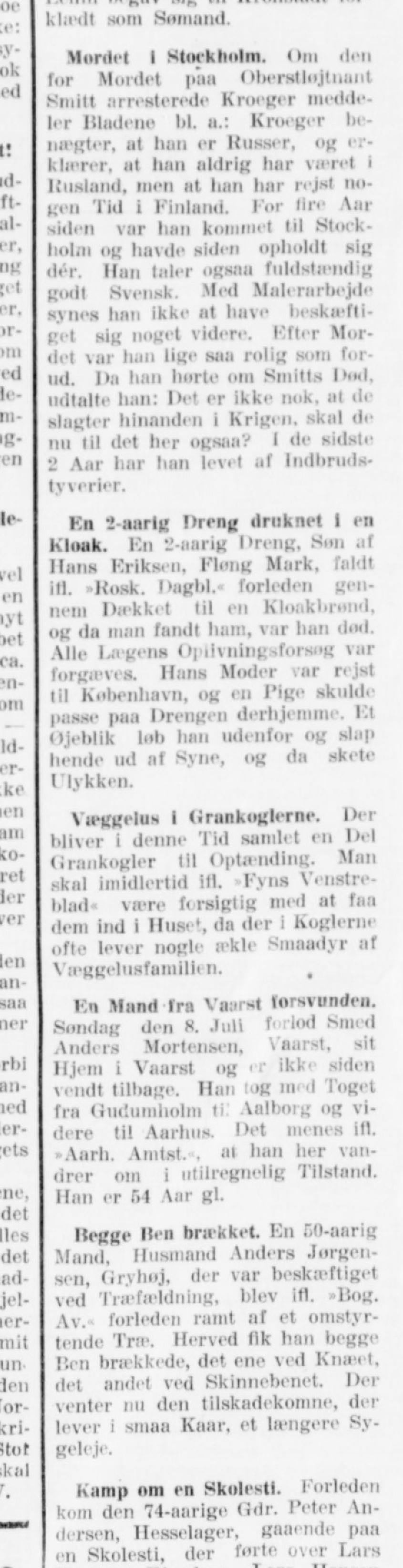 En 2-aarig Dreng, Søn af Hans Eriksen, Fløng Mark, faldt ifl. »Rosk. Dagbl.« forleden gennem Dækket til en Kloakbrønd, og da man fandt ham, var han død. Alle Lægens Oplivningsforsøg var forgæves. Hans Moder var rejst til København, og en Pige skulde passe paa Drengen derhjemme. Et Øjeblik løb han udenfor og slap hende ud af Syne, og da skete Ulykken.