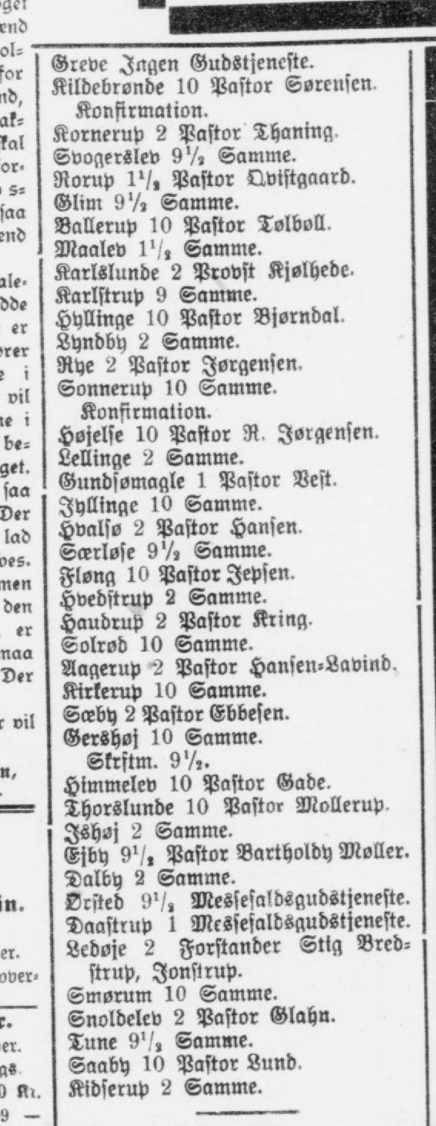 Greve Ingen Gudstjeneste. Kildebrønde 10 Pastor Sørensen Konfirmation. Kornerup 2 Pastor Thaning. Svogerslev 9'/, Samme. Rorup ll/» Pastor Qvistgaard. Glim 9'/, Samme. Ballerup 10 Pastor Tølboll. Maalev 1'/, Samme. Karlslunde 2 Provst Kjslhede- Karlstrup 9 Samme. Hyllinge 10 Pastor Bjørndal. Lyndby 2 Samme. Rye 2 Pastor Jørgensen. Sonnerup 10 Samme. Konfirmation. Højelse 10 Pastor R. Jørgensen. Lellinge 2 Samme. Gundsømagle 1 Pastor Best. Jyllinge 10 Samme. Hvalsø 2 Pastor Hansen. Særløse 9'/, Samme. Fløng 10 Pastor Jepsen. Hvedstrup 2 Samme. Haudrup 2 Pastor Kring. Solrod 10 Samme. Aagerup 2 Pastor Hansen-Lavind. Kirkerup 10 Samme. Sæby 2 Pastor Ebbesen. Gershoj 10 Samme. Skrstm. 9'/,« Himmelev 10 Pastor Gade. Thorslunde 10 Pastor Mollerup. Ishøj 2 Samme. Ejby 91/ Pastor Bartholdy Møller. Dalby 2 Samme. Qrsted 9'/, Messesaldsgudstjeneste. Daastrup 1 Messesaldsgudstjeneste. Ledøje 2 Forstander Stig Bred- strup, Jonstrup. Smørum 10 Samme. Snoldelev 2 Pastor Glahu. Tune 9'/, Samme. Saaby 10 Pastor Lund. Kidserup 2 Samme.