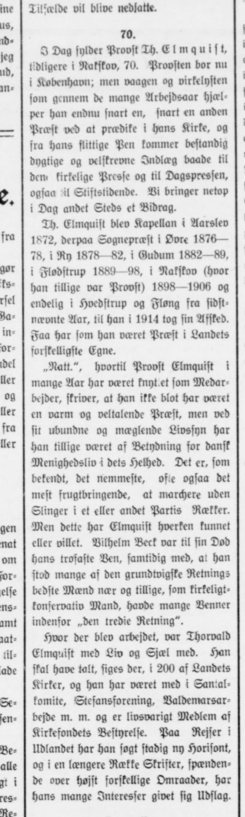 70. I Dag sylder Provst Th. E l m q u i s t. tidligere i Nakskov, 70. Provsten bor nu i Købeiihavn; men vaagcn og virkelysten som gcnnem de mange Arbcjdsaar hjælper han endnu snart en, snart en anden Præst ved at prædike i hans Kirke, og fra hans stittige Pen kommer bestandig dygtige og oclskreone Indlæg baade til drn< kirkelige Presse og til Dagspressen, ogsaa il Stiftstidende. Bi bringer netop i Dag andet Steds et Bidrag. Th. Elmquist blev Kapellan i Aarslev 1872, derpaa Sognepræst i Ovre 1876 — 78. i Ry 1878—82. i Gudum 1882—89, Flødstrup 1889 — 98, i Nakskov (hvor han tillige var Provst) 1898 — 1906 og endelig i Hvedstrup og Fløng fra sidst- nævnte Aar, til han i 1914 tog sin Afsked. Faa har som han været Præst i Landets forskelligste Egne. .Natt.", hvortil Provst Elmquist i mange Aar har været knyt et som Medarbejder, skriver, at han ikke blot har været en varm og veltalende Præst, men ved sil ubundne og mæglende Livssyn har han tillige været af Betydning for dansk Menighedsliv i dets Helhed. Det er, som bekendt, det nemmeste, ofte ogsaa det mest frugtbringende, at marchere uden Slinger i et eller andet Partis Rækker. Men dette har Elmquist hverken kunnet eller villet. Vilhelm Beck var til sin Død hans trofaste Ven, samtidig med, al han stod mange af den grundtvigske Retning; bcdste Mænd nær og tillige, som kirkeligt- konservativ Mand, havde mange Venner indenfor „den lredie Retning". Hvor der blev arbejdet, var Thorvald Elmquist med Liv og Sjæl med. Han skal have talt, siges der, i 200 af Landets Kirker, og han har været med i San:al- komite, Stcfansforcning, Valdcnmrsar- bejde m. m. og er livsvarigt Medlem af Kirkcfondets Bestyrelse. Paa Rejser i Udlandet har han søgt stadig ny Horisont, og i en længere Række Skrifter, spænden- de over højst forskellige Omraader, hor hans mange Interesser givet sig Udslag.