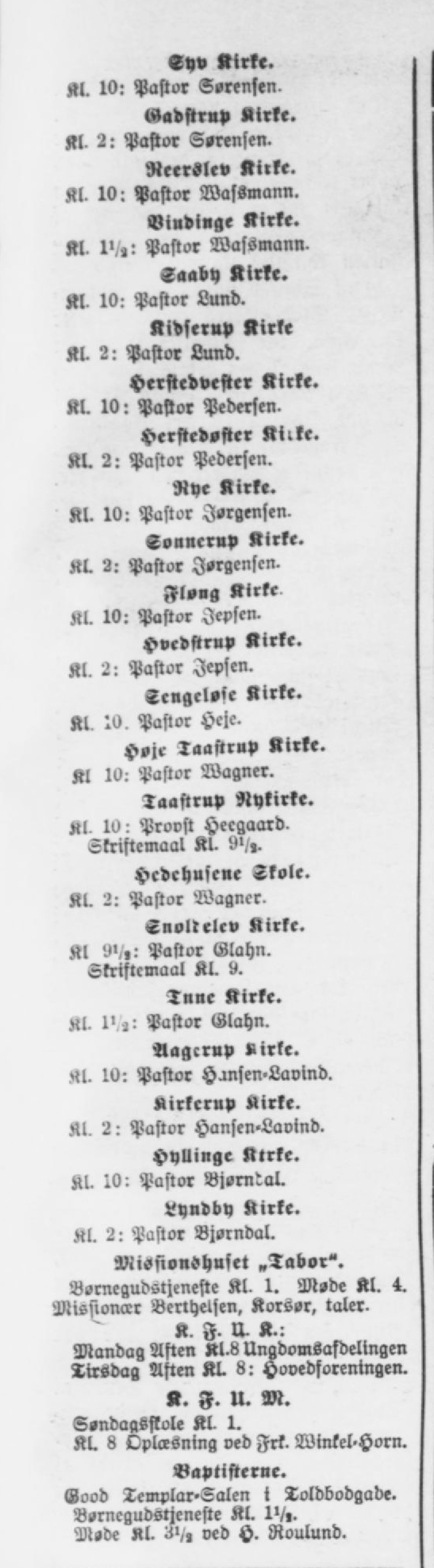 Syv Kirke. Al. 10: Pastor Sørensen. Gadstrup Kirke. Al. 2: Pastor Sørensen. Reerslev Kirke. Kl. 10: Pastor WafSmann. Vindinge Kirke. Al. 1>/,: Pastor WafSmann. Saaby Kirk«. Al. 10: Pastor Lund. Kibferup Kirke Al. 2: Pastor Lund. Herstedvester Kirk«. Al. 10: Pastor Pederfen. Herstedøster Kirte. Kl. 2: Pastor Pederfen. Rye Kirke. Kl. 10: Pastor Jørgensen. Sonnerup Kirke. Kl. 2: Pastor J-rgensen. Fløng Kirke Al. 10: Pastor Jepsen. Hvedstrup Kirke. Kl. 2: Pastor Jepsen. Scugelvic Kirke. Al. 10. Pastor Heje. Hojr laaftrup Kirke. Kl 10: Pastor Wagner. Taastrup Nykirke. Kl. 10: Provst Hecgaard- Skristemaal Kl. 9'/,. Hedehusene Skole. Kl. 2: Pastor Wagner. SnoUelev Kirke. Al 9«/,: Pastor Glahn. Skriftcmaal Kl. 9. Tnne Kirke. Kl. 1'. , : Pastor Glahn. Aagcrup Kirke. Kl- 10: Pastor Hansen-Lavind. Kirkcrup Kirke. Kl. 2: Pastor Hansen-Lavind. Hyllinge Ktrke. Kl. 10: Pastor Bjørntal. iiyudby Kirke. Kl. 2: Pastor Bjorndal. Missionshuset „Tabor'. BornegudStjeneste Kl. 1. Mode Kl. 4. Missionecr Benhelsen. Korsor, taler. K. I- Mandag Aften Kl.« Ungdomsafdelingen Tirsdag Aften Kl. «: Hovedforeningen. «. F. U. M. Sondagsflole Kl. 1. KU 8 Oplæsning ved Frk. Winkel-Horn. Baptisterne. Good Templar-Salen i Toldbodgade. BornegudStjeneste Kl. 1'/,. Atode Kl. 3«/« ved H. Roulund.