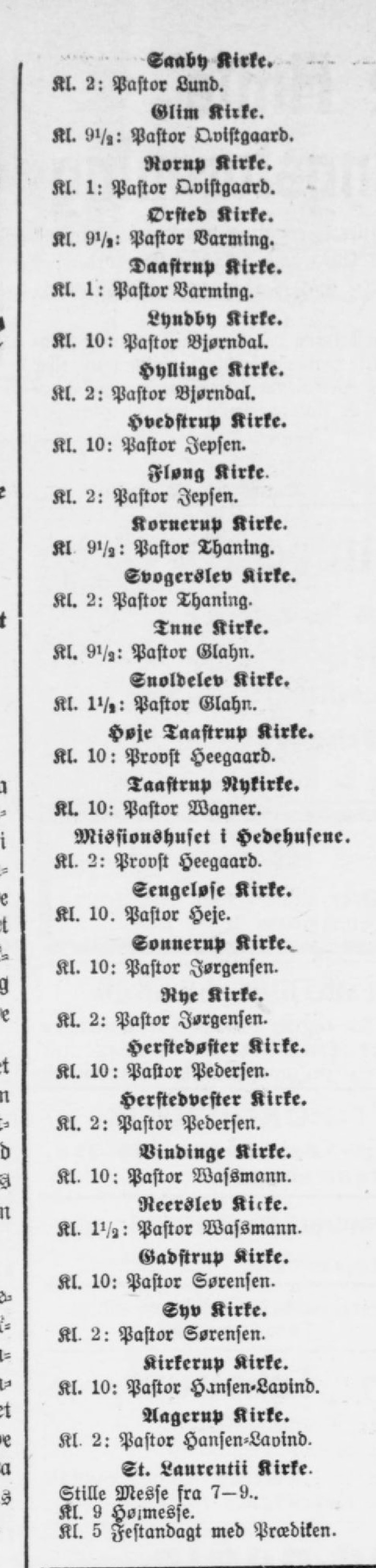 Saaby Kirke. Kl. 2: Pastor Lund. Glim Kirke. Kl. 9i/,: Pastor Qvistgaard. Rorup Kirke. Kl. 1: Pastor Qvistgaard. Orfted Kirke. Kl. 9«/,: Pastor Barwing. Daastrup Kirke. Kl. 1: Pastor Barming. Lyndby Kirke. Kl. 10: Pastor Bjørndat. Hyllinge Ktrke. Kl. 2: Pastor Bjørndal. Hvedstrup Kirke. Kl. 10: Pastor Jepsen. Fløng Kirke. Kl. 2: Pastor Jepsen. Kornerup Kirke. Kl S>/,: Pastor Thaning. Svogerslev Kirke. Kl. 2: Pastor Thaning. Tnne Kirke. Kl. 9i/,: Pastor Glahn. Suoldelev Kirke. Kl. I'/,: Pastor Glahn. Høje Taastrup Kirke. Kl. 10: Provst Heegaard. Taastrup Nykirke. KL 10: Pastor Wagner. Missionshuset i Hedehusene. Kl. 2: Provst Heegaard. Sengeløse Kirke. Kl. 10. Pastor Heje. Sonnerup Kirke. Kl. 10: Pastor Jørgensen. Rye Kirke. Kl. 2: Pastor Jørgensen. Herstedøster Kirke. Kl. 10: Pastor Pedersen. Herstedvester Kirke. Kl. 2: Pastor Pedersen. Vindinge Kirke. Kl. 10: Pastor Wassmann. ReerSlev Anke. Kl. IV,: Pastor Wassmann. Gadstrup Kirke. Kl. 10: Pastor Sørensen. Syv Kirke. Kl. 2: Pastor Sørensen. Kirkcrup Kirke. Kl. 10: Pastor Hansen-Lavind. Aagcrup Kirke. Kl. 2: Pastor Hansen-Lavind. St. Laurentii Kirke. Stille Messe fra 7—9.. Kl. 9 Hoimesse. Kl. 5 Festandagt med Prædiken.