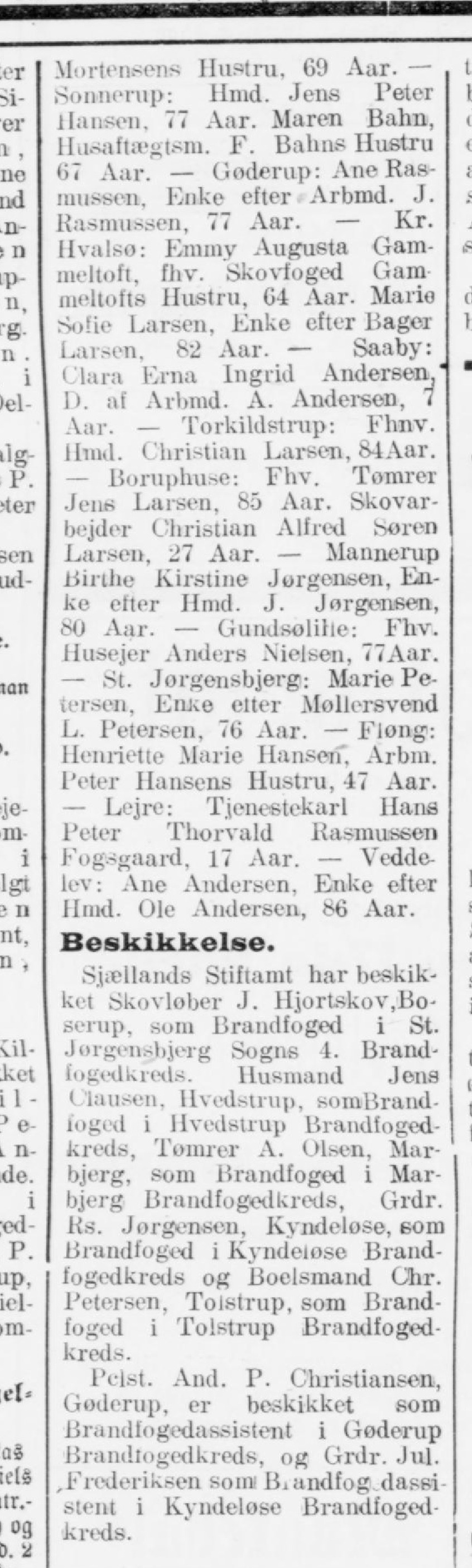 Mortensens Hustru, 69 Aar. — Sonnerup: Hmd. Jens Peter Hansen, 77 Aar. Maren Bahn, Husaftægtsm. F. Bahne Hustru 67 Aar. — G oder up: Ane Rasmussen, Enke efter Arbmd. J. Rasmussen, 77 Aar. — Kr. Hvalsø: Emmy Augusta Gammeltoft, fhv. Skovfoged Gam meltofts Hustru, 64 Aar. Mario Solie Larsen, Enke efter Bager Larsen, 82 Aar. — Saaby: Clara Erna Ingrid Andersen, D. af Arbmd. A. Anderson, 7 Aar. — Torkildstrap: Fhnv. Hmd. Christian Larsen, 84Aar. — Boruphuse: Fhv. Tomrer Jens Larsen, 85 Aar. Skovarbejder Christian Alfred Søren Larsen, 27 Aar. — Mannerup Birthe Kirstine Jørgensen, Enke efter Hmd. J. Jørgensen, 80 Aar. — Gundsolille: Fhv. Husejer Anders Nielsen, 77Aar. — St. Jorgensbjerg: Marie Petersen, Enxe citer Møllersvend L. Petersen, 76 Aar. — Fløng: Henriette Marie Hansen, Arbm. Peter Hansens Hustru, 47 Aar. — Lejre: Tjenestekarl Hans Peter Thorvald Rasmussen Fogsgaard, 17 Aar. — Veddelev: Ane Andersen, Enke efter Hmd. Ole Andersen, 86 Aar. Beskikkelse. Sjællands Stiftamt har beskikket Skovløber J. Hjortskov, Boserup, som Brandfoged i St. Jorgensbjerg Sogns 4. Brand- fogedkreds. Husmand Jens Clausen, Hvedstrup, somBrand- ioged i Hvedstrup Brandfogedkreds, Tømrer A. Olsen, Mar- bjerg, som Brandfoged i Mar- bjerg Brandfogedkreds, Grdr. Rs. Jørgensen, Kyndeløse, som Brandfoged i Kyndetøse Brandfogedkreds og Boelsmand Chr. Petersen, Tolstrup, som Brandfoged i Tolstrup Brandfoged- kreds. Pclst. And. P. Christiansen, Gøderup, er beskikket som Brandfogedassistent i Gøderup Brandtogedkreds, og Grdr. Jul. , Frederiksen somi Bi audfog dassi stent i Kyndeløse Brandfogedkreds.
