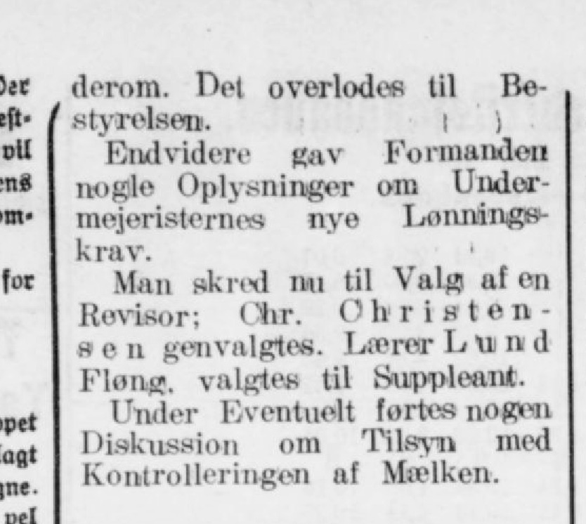derom. Det overlodes til Bestyrelsen. 1 ) Endvidere gav Formanden nogle Oplysninger om Hilder mejeristernes nye Lønnings- krav. > Man skred nu til Valg af en Revisor; Chr. Christen- s e 11 genvalgtes. Lærer Lund Fløng, valgtes til Suppleant. Under Eventuelt førtes nogen Diskussion om Tilsyn med Kontrolleringen af Mælken.