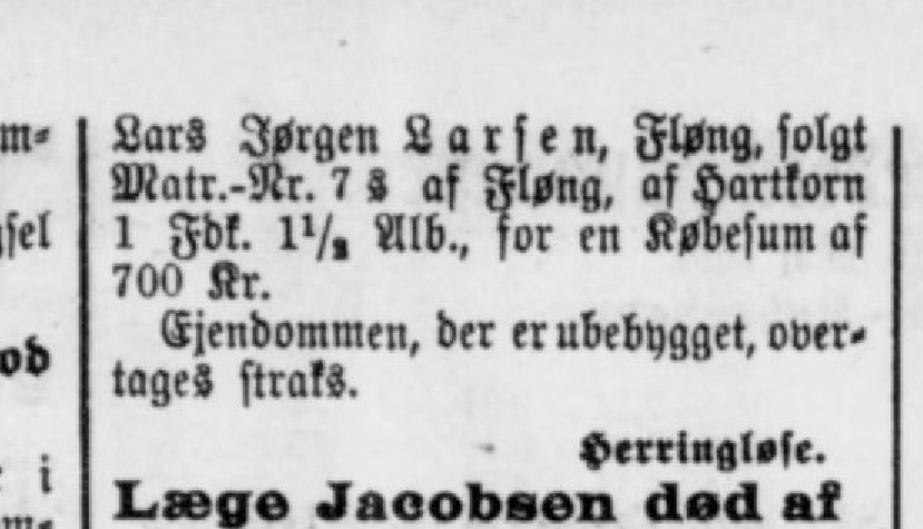 Solgt JordlodHusejer ?? ?? ?? Jeppesen af Hedehusene har til fhv. Husejer Lars Jørgen Larsen, Fløng, solgt Matr.-Nr. 7 s af Fløng, af Hartkorn 1 ???. 1 1/2 ???., for en Købesum af 700 Kr.