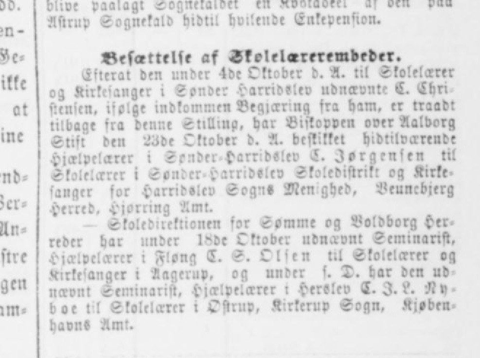 Besættelse af Skotetæreremdeder. Eflcrat dcn undcr Idr Oktabcr d. A. til Skolelærer oz Kirkesanger i Sønder Harridølev udnævnte S. Ebri fienien. ifølge indkommen Begiær ng fra ham, er traadl tilbage fra denne Sttlling, har Biskoppen over Aalborg gttft den 23de Oktober d. A. beflittet hidtilværende Hjælpelærer i Sender Harridølev ®. jørgenfen til Skalelærer i Spiwer-Harridølev Skoledistrikt og Kirke- sanger for Harridølev Sogn« Men ghed, Beuncbferg Herred, Hjorring Amt. - Skoledirektionen for Sømme og Boldborg Her- reder har under I8de Oktober udnævnt Seminarist, Hjælpelærer i Fløng E. S. Olsen til Stolelærer ag Kirkesanger i Aagerup, og under s. T. har den ud nævnt Seminarist, Hfælpelærer i Herdlev E. I. ?. Ny- boe til Stolelærer i Ostrup, Kirkenip Sogn, Kjøbenhavn« Amt.