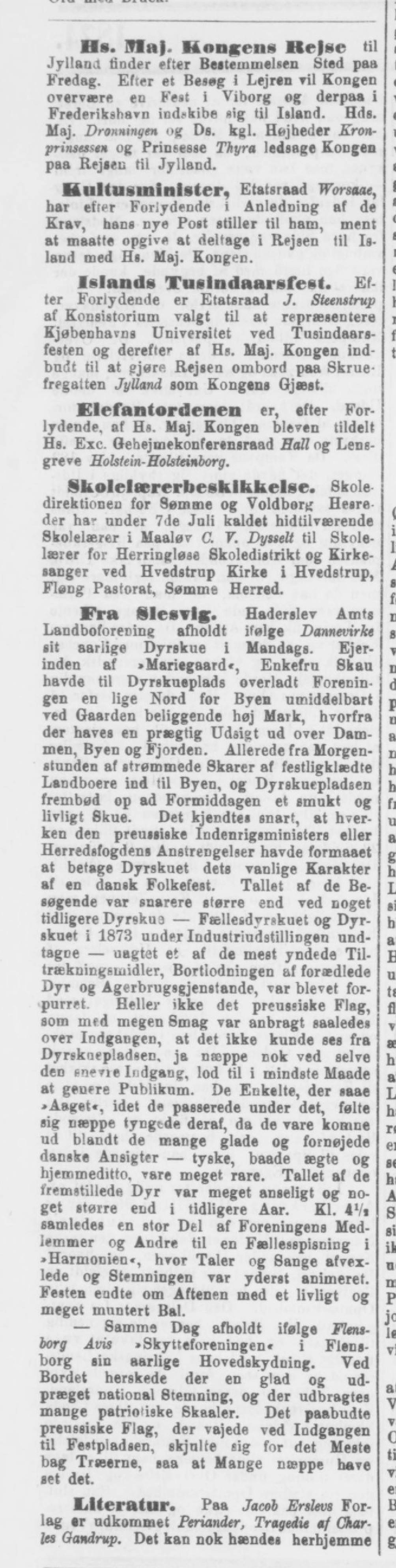 H». IVIn). Kongens Helse til Jylland tinder efter Bestemmelsen Sted paa Fredag. Efter et Besøg i Lejren ril Kongen overvære en Fest i Viborg og derpaa i Frederikshavn indskibe sig til Island. Hds. Maj. Dronningen og Ds. kgl. Højheder Kron- prinsessen og prinsesse Thyra ledsage Kongen paa Rejsen til Jylland. Hultusillinlster, Etatsraad Worsaae, har efter Forlydende i Anledning af de Krav, hans nye Post stiller til ham, ment at maatte opgive at deltage i Rejsen til Island med Hs. Maj. Kongen. Islands Tuelndaarsfeet. Efter Forlydende er Etatsraad J. Steenstrup af Konsistorium valgt til at repræsentere Kjøbenhavns Universitet ved Tusindaars- festen og derefter af Hs. Maj. Kongen indbudt til at pjøre Rejsen ombord paa Skruefregatten Jylland som Kongens Gjæst. Elefantordenen er, efter Forlydende. af Hs. Maj. Kongen bleven tildelt Hs. Exe. Gehejmekonfertnsraad Hall og Lensgreve Holstein-Holsteinhor g. Sbolelaererbesklkbelse. Skole direktionen for Sømme og Voldberg Hesre der har under 7de Juli kaldet hidtilværende Skolelærer i Maalør C. V. Dysselt til Skolelærer for Herringløse Skoledistrikt og Kirkesanger ved Hvedstrup Kirke i Hvedstrup, Fløng Pastorat, Sømme Herred. Era Slesvig. Haderslev Amts Landboforening afholdt ifølge Dannevirke sit aariige Dyrskue i Mandags. Ejer- inden af »Mariegaard«, Enkefru Skau havde til Dyrskueplads overladt Foreningen en lige Nord for Byen umiddelbart ved Gaarden beliggende høj Mark, hvorfra der haves en prægtig Udsigt ud over Dammen, Byen og Fjorden. Allerede fra Morgenstunden af strømmede Skarer af festligklædte Landboere ind til Byen, og Dyrskuepladsen frembød op ad Formiddagen et smukt og livligt Skue. Det kjendtes snart, at hverken den preussiske Indenrigsministers eller Herredsfogdens Anstrengelser havde formaaet at betage Dyrskuet dets vaulige Karakter af en dansk Folkefest. Tallet af de Besøgende var snarere større end ved noget tidligere Dyrskua — Fællesdyrskuet og Dyrskuet i 1873 under Industriudstillingeu und- tagne — uagtet et af de mest yndede Til- trækningsmidler, Bortlodningen af forædlede Dyr og Agerbrugsgjenstande, var blevet forpurret. Heller ikke det preussiske Flag, som med megen Smag var anbragt saaledes over Indgangen, at det ikke kunde ses fra Dyrskuepladsen, ja næppe nok ved selve den enevie Indgang, lod til i mindste Maade at genere Publikum. De Enkelte, der saae »Aaget«, idet de passerede under det, følte sig næppe tyngede deraf, da de vare komne ud blandt de mange glade og fornøjede danske Ansigter — tyske, baade ægte og hjemmeditto, vare meget rare. Tallet af de fremstillede Dyr var meget anseligt og noget større end i tidligere Aar. Kl. 4Vi samledes en stor Del af Foreningens Medlemmer og Andre til en Fællesspisning i »Harmonien«, hvor Taler og Sange afvex- lede og Stemningen var yderst animeret. Festen endte om Aftenen med et livligt og meget muntert Bal. — Samme Dag afholdt ifølge Flensborg Avis »Skytteforeningen« i Flensborg sin aariige Hovedskydning. Ved Bordet herskede der en glad og udpræget national Stemning, og der udbragtes mange patriotiske Skaaler. Det paabudte preussiske Flag, der vajede ved Indgangen til Festpladsen, skjnite sig for det Meste bag Træerne, eaa at Mange næppe have set det. litteratur. Paa Jacob Erslevs Forlag er udkommet Periander, Tragedie af Charles Oandrup. Det kan nok hændes herhjemme